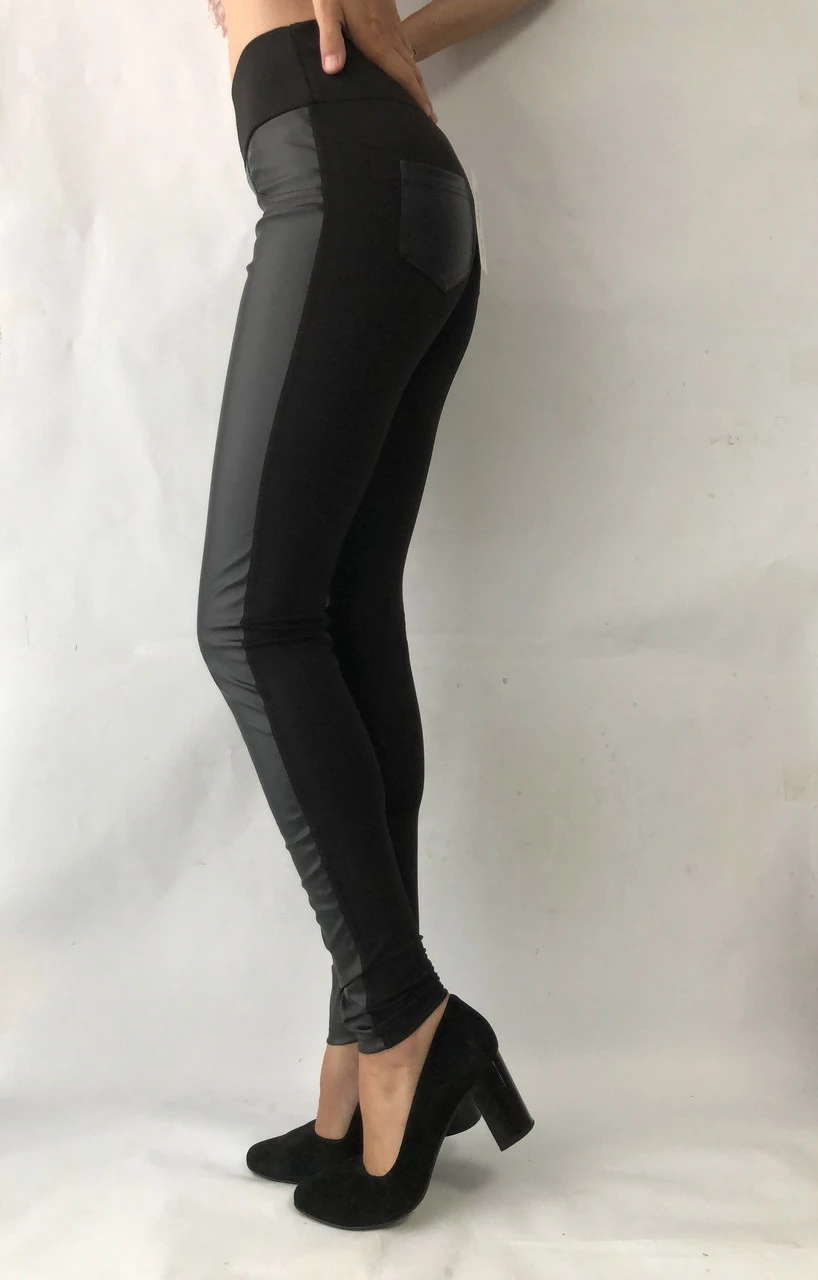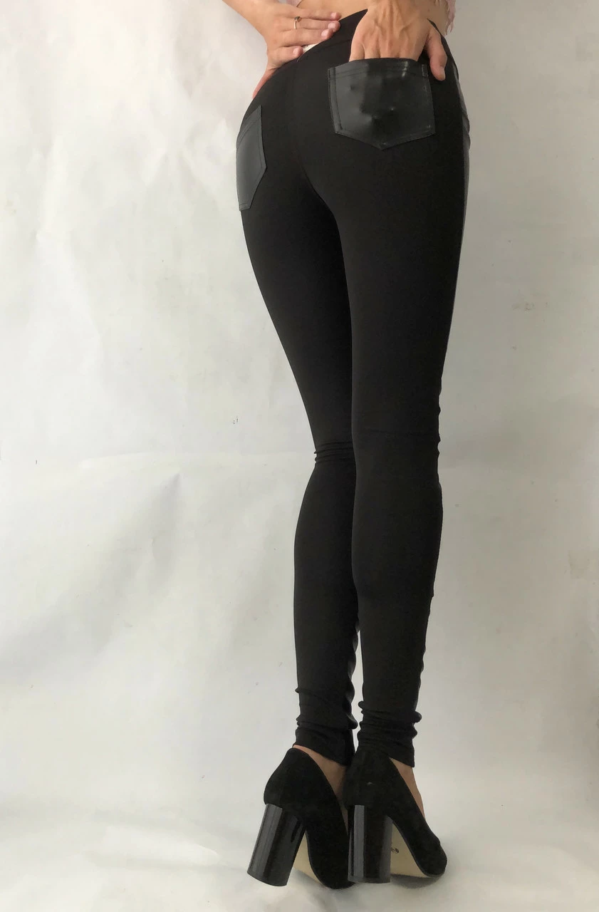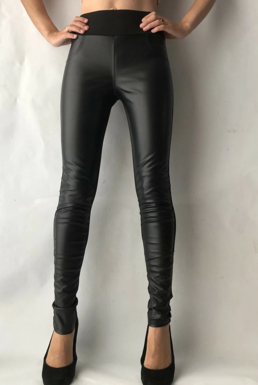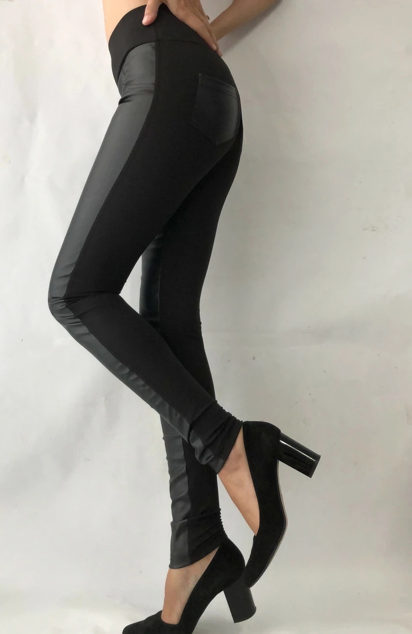 Черные женские лосины – лучший вариант для весенне-осеннего периода. Данная модель пошита из высококачественных материалов. Передняя часть выполнена из кожзаменителя, а задняя из дайвинга и дополнена кожаными карманами. Благодаря широкому и эластичному поясу их легко одевать. Лосины отлично садятся по фигуре, плотно облегают ноги, не сковывают движений и хорошо тянутся. Поэтому они надолго сохранят свой первичный вид и прослужат вам очень долгий период.