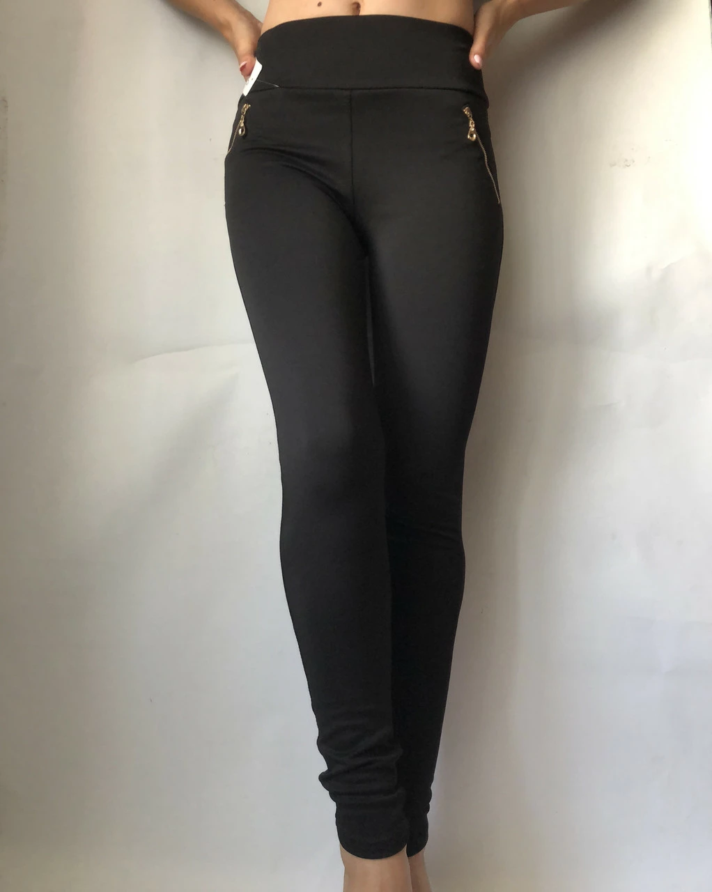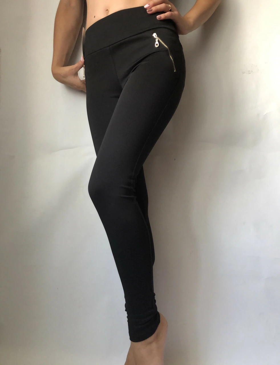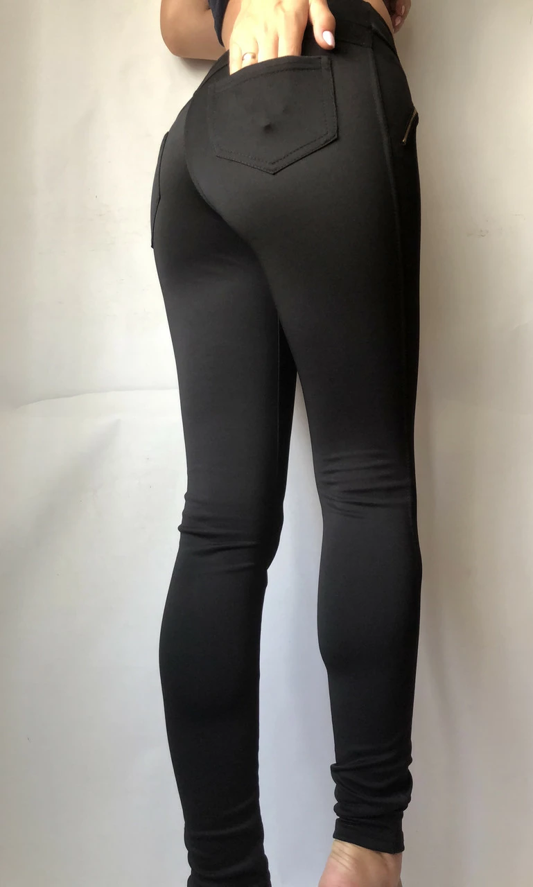 Черные женские лосины в классическом стиле – лучший вариант для весенне-осеннего периода. Данные лосины имеют среднюю посадку на широком, эластичном и мягком поясе, что обеспечивает комфортную посадку. Эта модель изготовлена из высококачественных материалов. Лосины отлично садятся по фигуре, плотно облегают ноги, не сковывают движений и хорошо тянутся. Поэтому они прослужат вам очень долго. Фурнитура в качестве замочков на карманах придает нарядности, соответственно их можно носить как брюки с укороченным верхом.