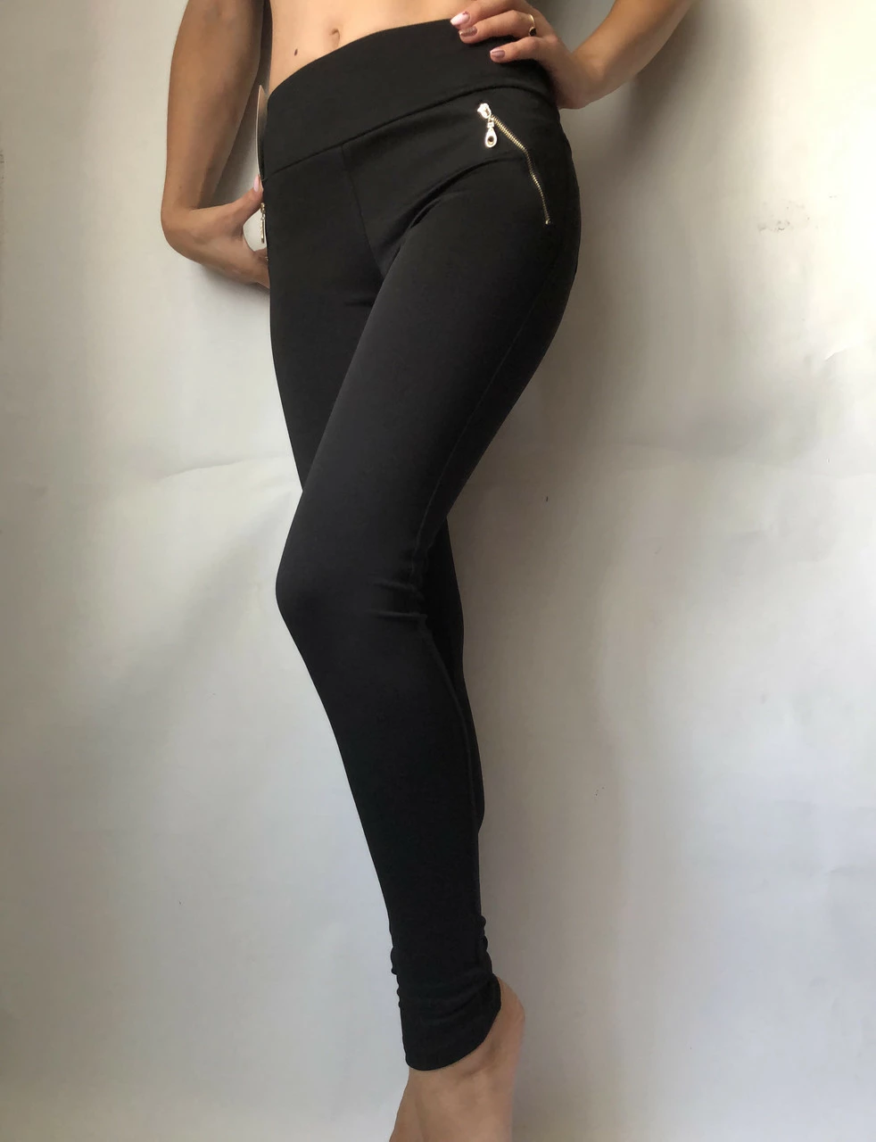 Черные женские лосины в классическом стиле – лучший вариант для осеннего-зимнего периода. Данные лосины имеют среднюю посадку на широком, эластичном и мягком поясе, что обеспечивает комфортную посадку. Эта модель изготовлена из высококачественных материалов. Лосины отлично садятся по фигуре, плотно облегают ноги, не сковывают движений и хорошо тянутся. Поэтому они прослужат вам очень долго. Фурнитура в качестве замочков на карманах придает нарядности, соответственно их можно носить как брюки с укороченным верхом.