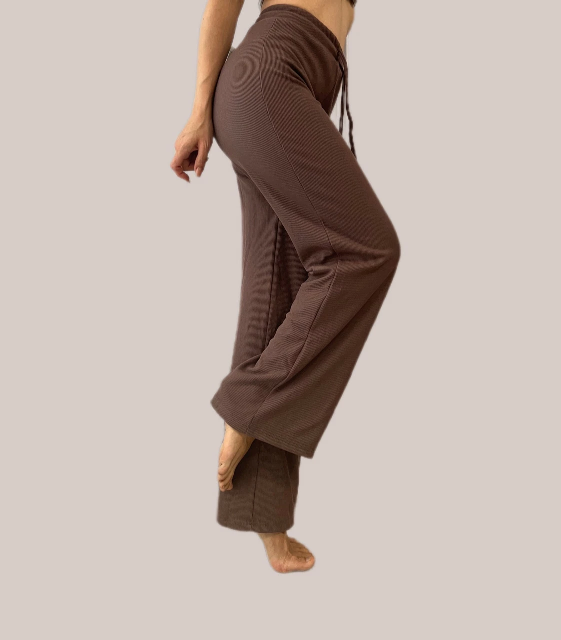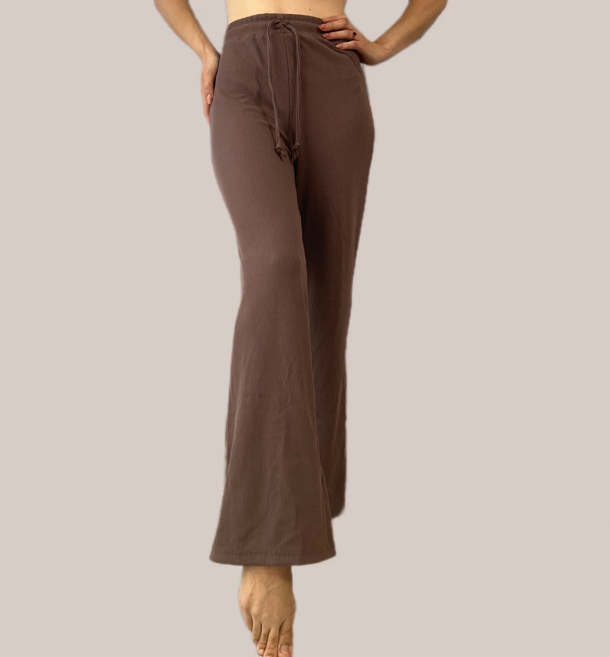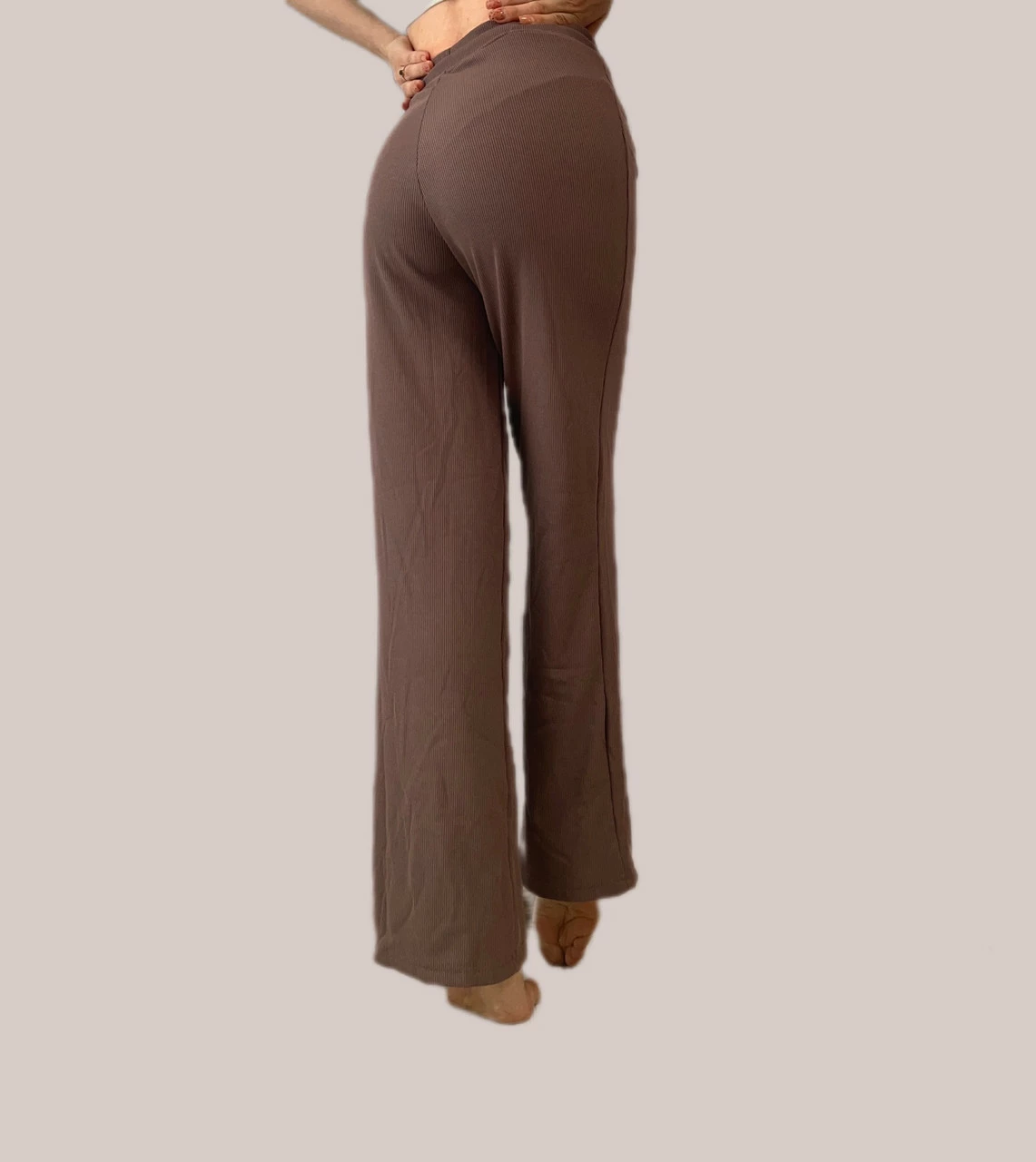Брюки изготовлены из качественной ткани трикотаж рубчик, мягкие, приятные к телу и очень удобные. С высокой талией на резинке и с полноценным шнурком.