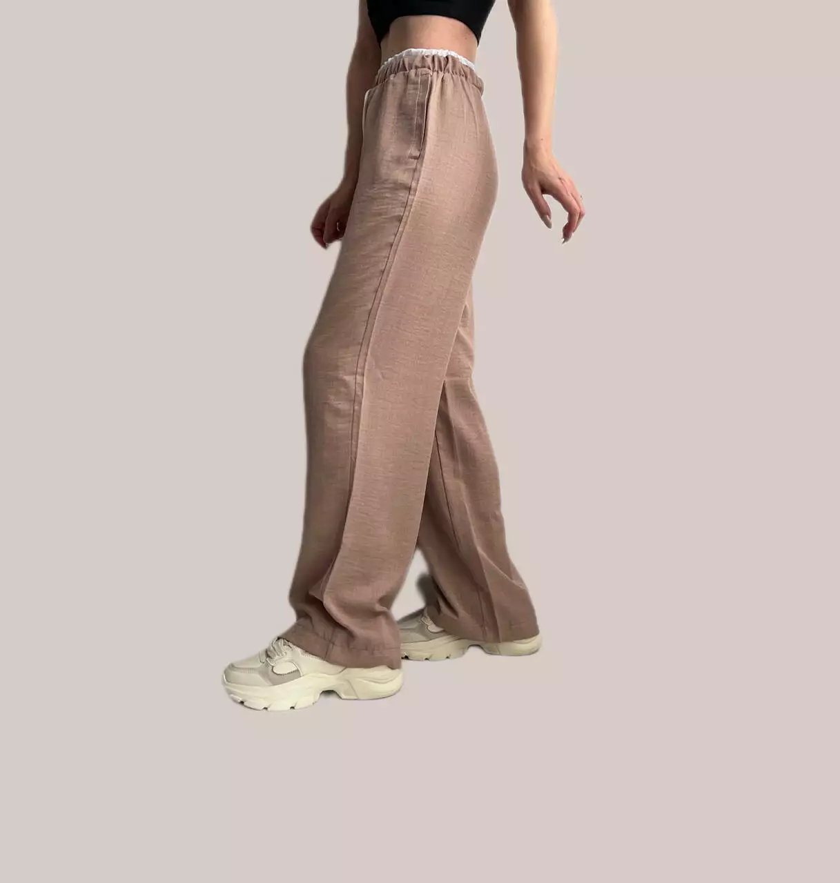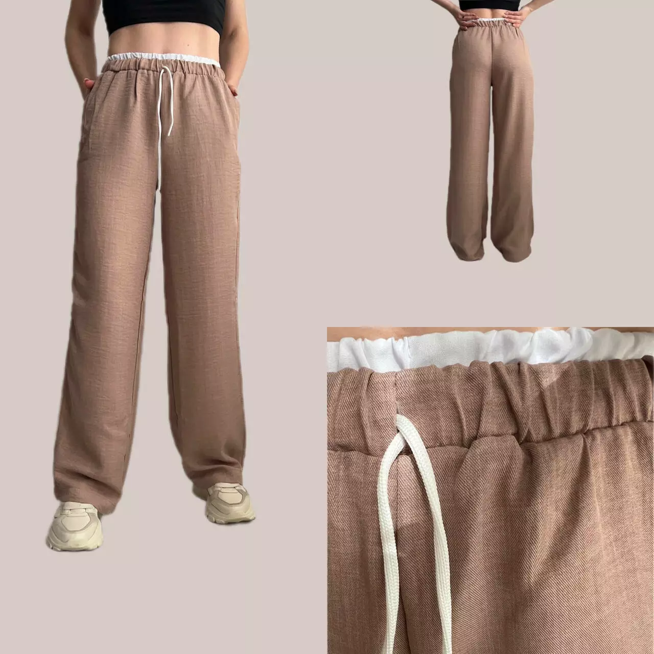 Трендові літні брюки-палаццо з імітацією білизни, виконані з високоякісної тканини льон-коттон. Це щільна і в одночас легка тканина тому в цих штанах вас не буде жарко навіть в самий спекотний день.