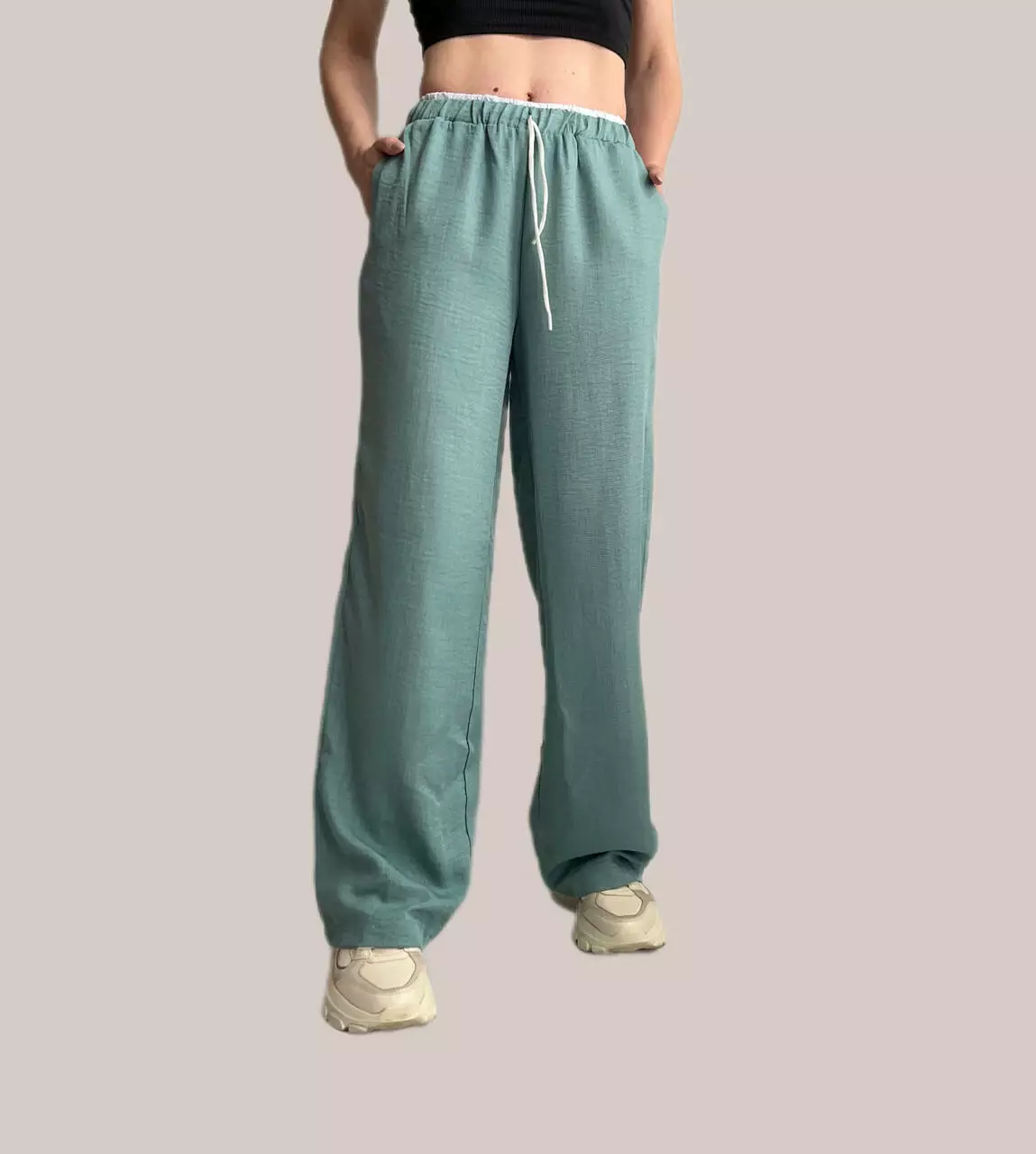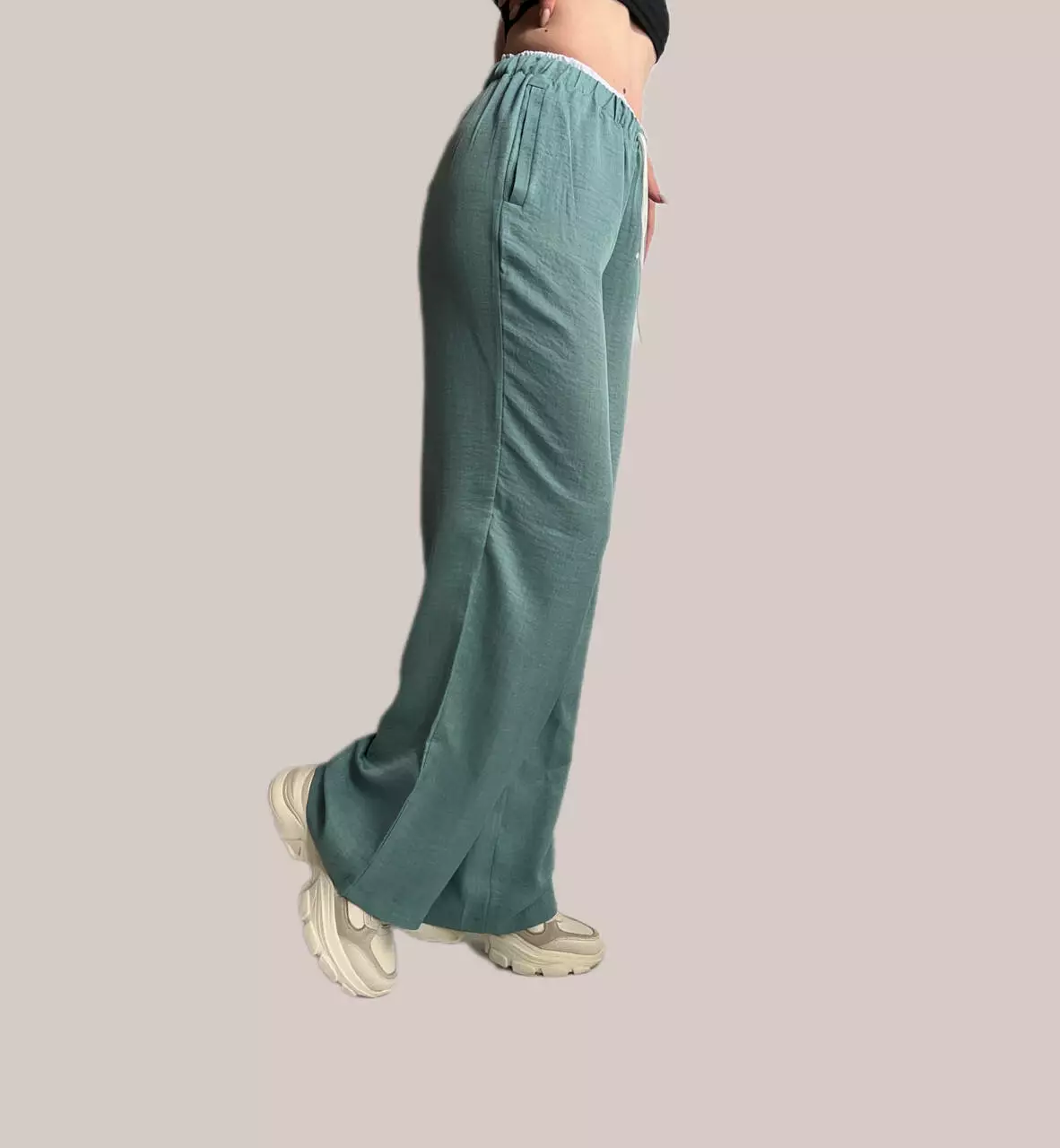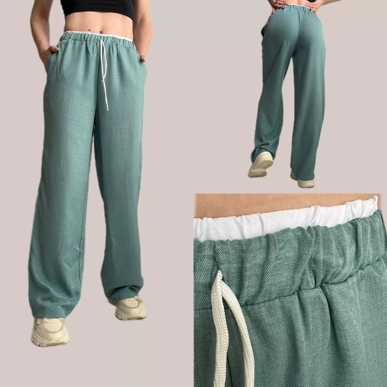 Трендові літні брюки-палаццо з імітацією білизни, виконані з високоякісної тканини льон-коттон. Це щільна і в одночас легка тканина тому в цих штанах вас не буде жарко навіть в самий спекотний день.