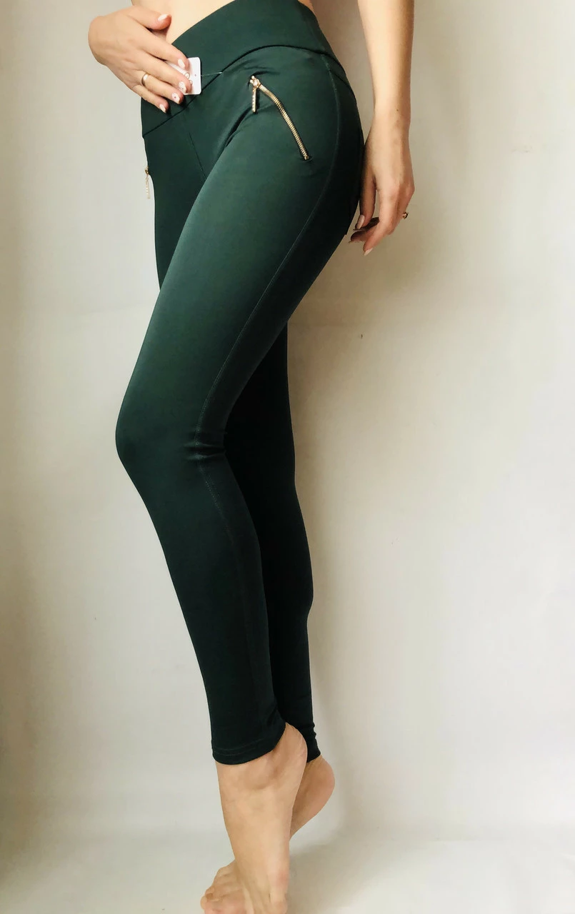 Фурнитура в качестве замочков на карманах придает нарядности, соответственно их можно носить как брюки с укороченным верхом. Лосины отлично садятся по фигуре, плотно облегают ноги, не сковывают движений и хорошо тянутся.